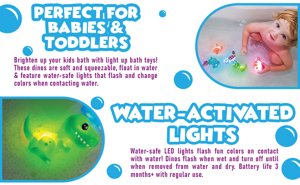 FUN IN THE TUB: Brighten up your kids bath with light up bath toys! These soft & squeezable dinosaur toys float in water & feature water-safe lights that flash & change colors when contacting water.