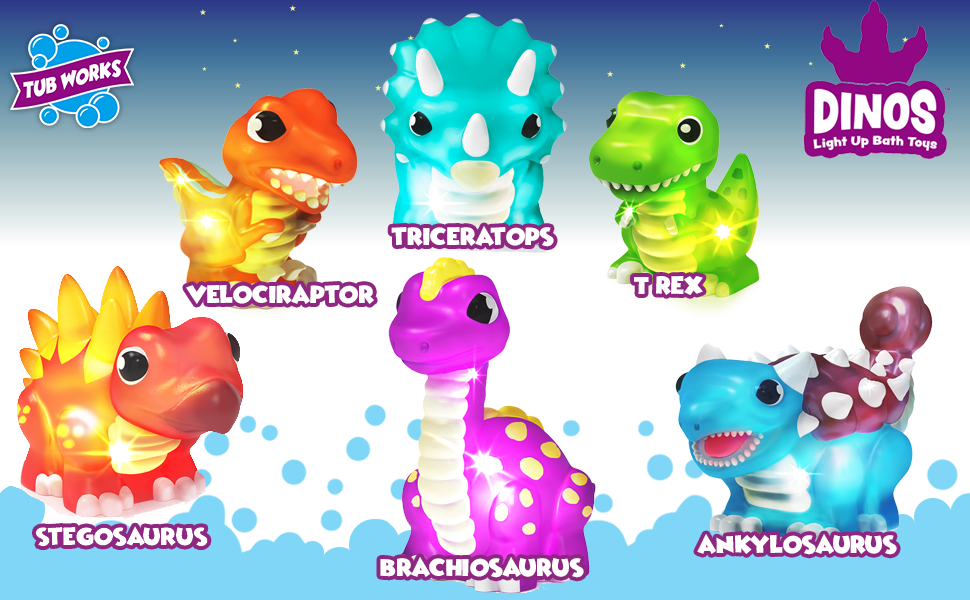 DINOSAUR BATH TOYS 6 PACK: Includes (6) exclusive light up bath toys featuring popular dinos - T-Rex, Triceratops, Ankylosaurus, Brachiosaurus, Stegosaurus & Velociraptor - must-have kids bath toys!