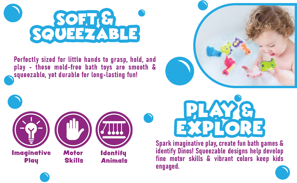 PLAY & EXPLORE: Spark imaginative play, create fun bath games & bring dinosaur toys to life with kids bath toys! Squeezable designs help develop fine motor skills & vibrant colors keep kids engaged.