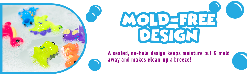 MOLD-FREE DESIGN: Our baby & toddler bath toys are sealed to keep moisture out & make clean-up a breeze! A seamless, no hole bath toys design keeps water out & mold away - ideal for no mold bath toys!