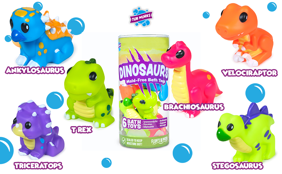 DINO 6 PACK: Set includes (6) exclusive Mold Free Bath Toys featuring popular dinosaurs - T-Rex, Triceratops, Brachiosaurus, Stegosaurus, Ankylosaurus & Velociraptor - must-have tub toys for a roarin' good kids bath!
